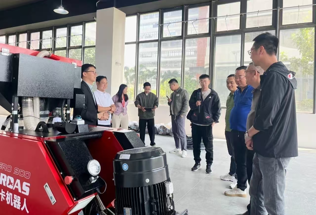 Recently, Li Haoran, Vice President of Operations of Zhenghao Holding Group, and Wei Yaoyu, Assistant to the Vice President; Hu Zhouwei, the commander of major projects of Zhenghao Construction Engineering Co., LTD., Liu Mo, the deputy general manager, Diao Zhipeng, the assistant to the general manager, and Hu Zhantao, the business manager, visited Foshan Orcas Robot (hereinafter referred to as "Orcas") to explore the field of intelligent construction, inspect and exchange two of Orcas's most advanced floor grinding machines in the world, and seek new opportunities for the transformation of the construction industry.